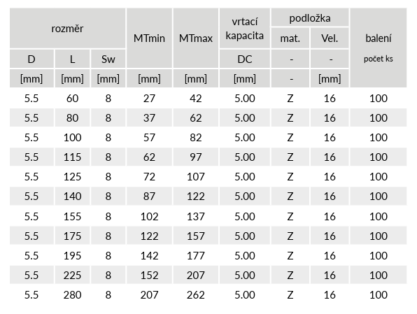 Samovrtné šrouby ocelové, pozinkované s šestihrannou hlavou s ocelovou podložkou s EPDM těsněním se závitem pod hlavou.