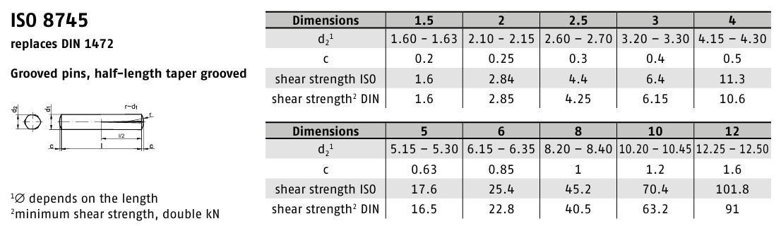 Kolíky DIN 1472 jsou kuželové rýhované kolíky, které zajišťují pevné a přesné spojení součástí. Díky svému kuželovému tvaru a rýhování se po zatlučení rozepnou a pevně se zaklíní v otvoru.