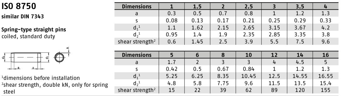 Kolíky DIN 7343 jsou válcové kolíky stočené z pružinového drátu, které zajišťují pružné a pevné spojení součástí. Díky své spirálové konstrukci se lehce deformují a přizpůsobí se malým nepřesnostem ve vyvrtaných otvorech.