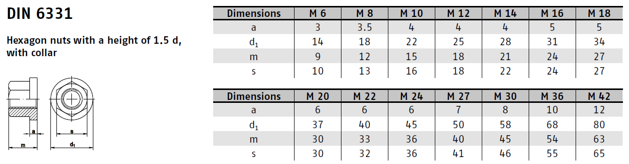 Matice DIN 6331 je šestihranná matice s nákružkem, která nabízí spolehlivé a pevné upevnění. Díky své konstrukci s nákružkem se hodí pro aplikace, kde je vyžadována zvýšená odolnost proti povolení, vibracím a otřesům. Vyrábí se z vysoce kvalitní oceli a je k dispozici v různých velikostech a povrchových úpravách.