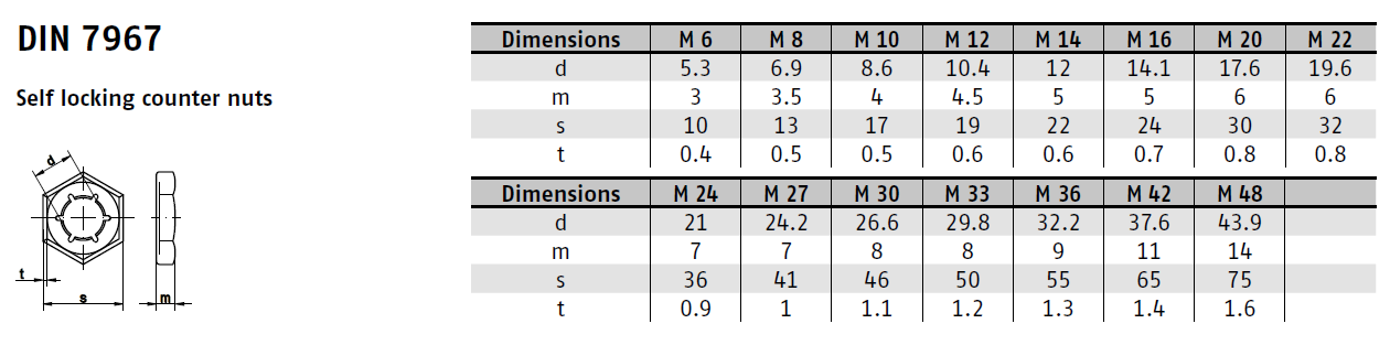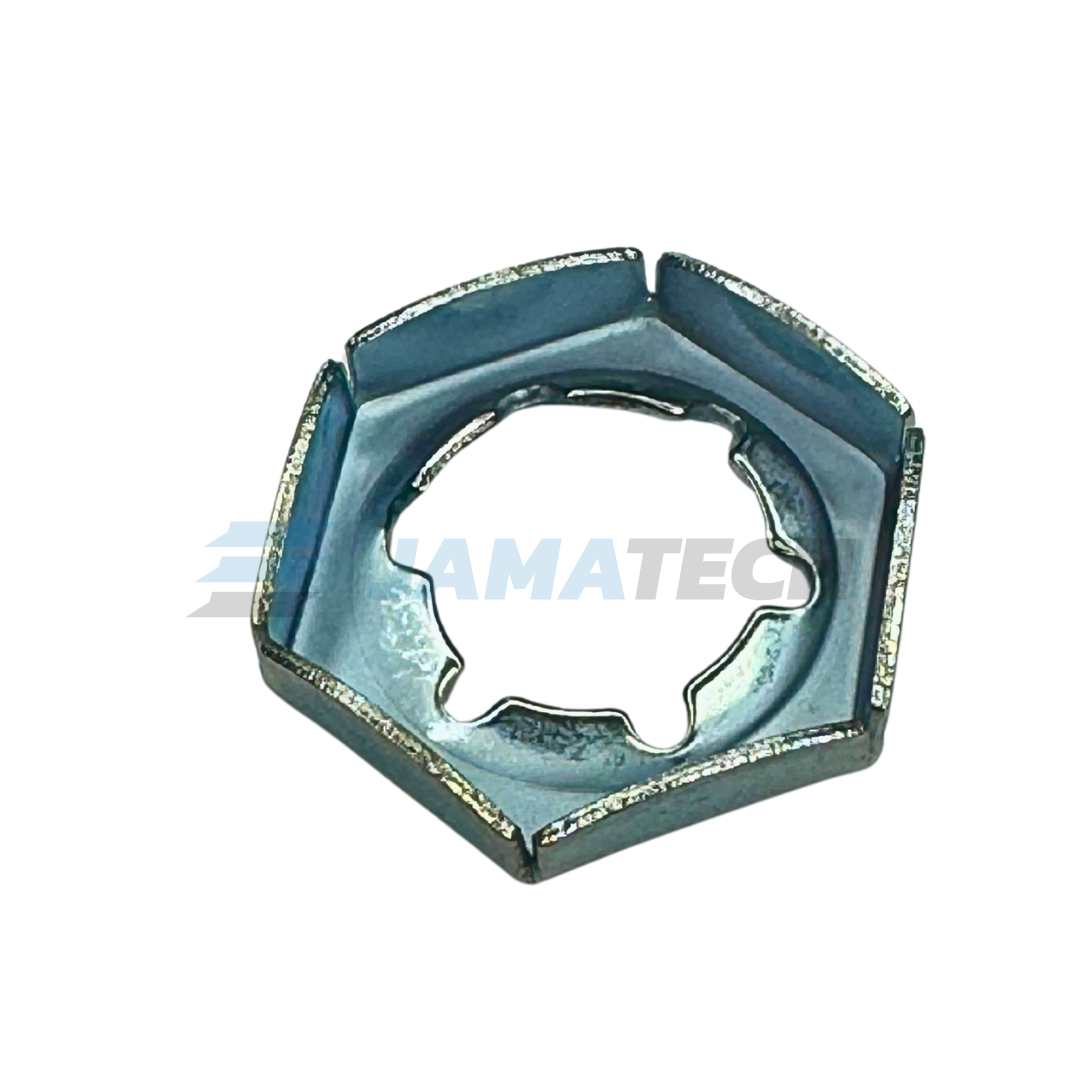 Matice DIN 7967 je spolehlivá pojistná matice, která zajišťuje pevné a bezpečné spojení v náročných podmínkách. Díky své konstrukci s lisovanými segmenty, které při utažení vytvářejí tlak proti šroubu, se tato matice sama zajistí a zabrání samovolnému povolení.