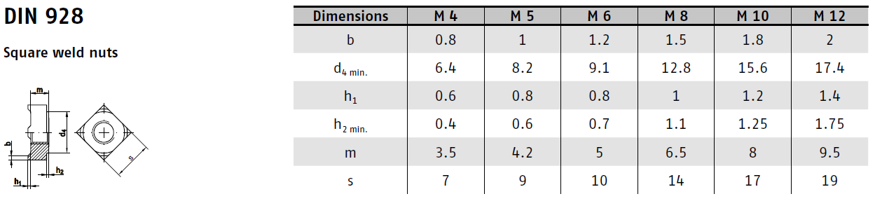 Matice DIN 928 jsou čtyřhranné navařovací matice určené k pevnému přivaření na kovové povrchy. Díky svému čtyřhrannému tvaru zajišťují lepší stabilitu při svařování a větší kontaktní plochu pro pevné spojení. Používají se v kovovýrobě, automobilovém průmyslu a při výrobě ocelových konstrukcí. Matice DIN 928 se vyrábějí z oceli a jsou dostupné s různými povrchovými úpravami, například fosfátováním nebo zinkováním. Vhodné pro aplikace vyžadující pevné šroubové spoje bez potřeby vrtání.
