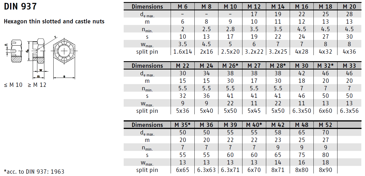 Matice DIN937 jsou šestihranné nízké matice se zářezy pro pojistné závlačky , určené k zajištění šroubových spojů proti povolení. Tyto matice se používají zejména tam, kde je potřeba úspora místa nebo kde je vyžadováno nízké provedení. Vyrábějí se z oceli, nerezové oceli a dalších materiálů s různými povrchovými úpravami. Jsou pro použití v průmyslu, strojírenství a automobilovém sektoru. Pro správnou funkci je nutné matice zajistit závlačkou.