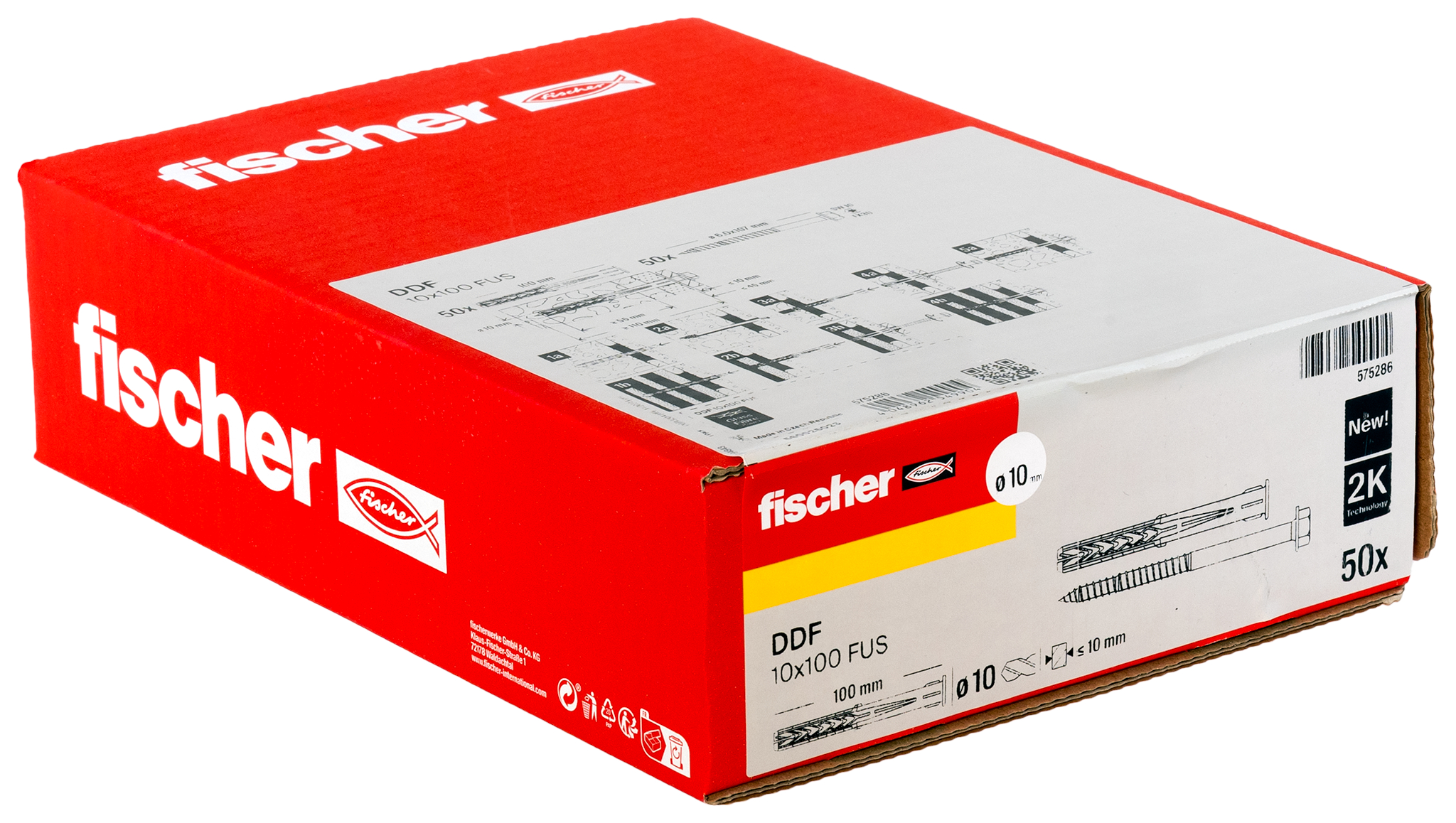 Plastová kotva DDF je určená k upevňování zařizovacích předmětů na stěny z betonu, plného, děrovaného nebo plynosilikátového zdiva, na které jsou desky sádrokartonu upevněné pomocí lepidla nebo dřevěných lišt. Červený krček kotvy z tvrzeného plastu je vyztužený skelnými vlákny a spolehlivě přemosťuje vzduchovou mezeru mezi sádrokartonem a nosnou zdí. Koncept rozpěrné zóny, který se osvědčil u rámové hmoždinky SXRL, dosahuje vysokých nosností v plných i děrovaných stavebních materiálech. Kotva DDF je vhodná k upevnění držáků plochých TV (i výklopných), radiátorů, polic a kuchyňských skříněk. Přiložený bezpečnostní šroub je zárukou bezpečného upevnění a bezproblémové montáže díky utahovací drážce TX.