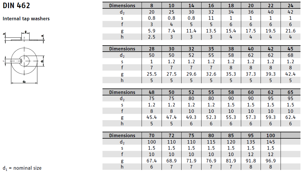 DIN 462 označuje speciální typ pojistné podložky, která je navržena tak, aby zajistila pevnost a odolnost šroubových spojů, zejména v podmínkách vibrací nebo střídavého zatížení. Díky svému tvaru s vnitřním nosem zajišťuje tato podložka spolehlivé ukotvení šroubu nebo matice a brání jejich samovolnému povolení.
