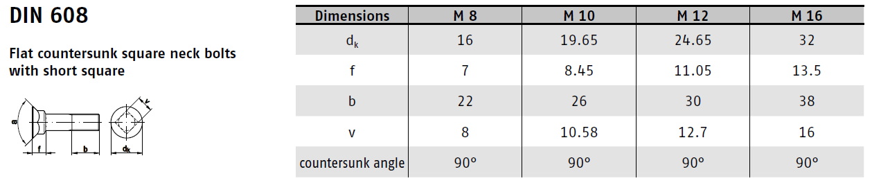 DIN 608 je norma pro pluhové šrouby se zápustnou hlavou a čtyřhranným dříkem. Tyto šrouby jsou specifické svým tvarem a jsou určeny pro spoje, kde je jedním z prvků kov. Často se používají v zemědělských strojích a zařízeních, ale i v jiných aplikacích, kde je vyžadována vysoká pevnost a odolnost spoje.