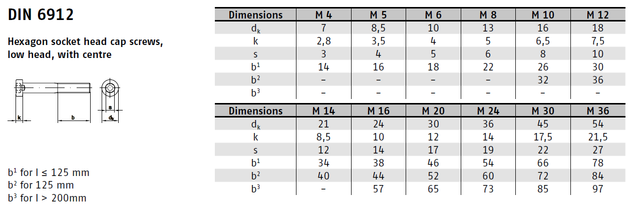 DIN 6912 je norma pro šrouby s válcovou hlavou a vnitřním šestihranem (Inbus). Tyto šrouby jsou specifické svou nízkou hlavou se středícím otvorem. Používají se v případech, kdy hlava šroubu nesmí příliš vyčnívat nad povrch spoje, například u krytů, panelů a dalších součástí, kde je omezený prostor.