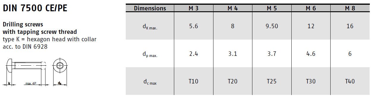 DIN 7500C je norma pro závitořezné šrouby s půlkulatou hlavou a křížovou drážkou (Phillips). Tyto šrouby jsou navrženy tak, aby si samy vytvořily závit v materiálu, do kterého jsou zašroubovány. To usnadňuje a urychluje montáž, protože není nutné předvrtávat otvor se závitem.