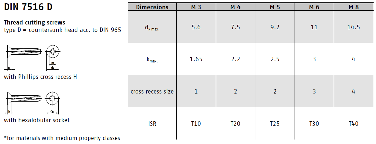DIN 7516D je norma specifikující závitotvorný šroub s zápustnou hlavou a křížovou drážkou (obvykle Phillips). Tento typ šroubu je navržen tak, aby při zašroubování do materiálu vytvořil vlastní závit. To znamená, že není potřeba předvrtávat otvor se závitem,