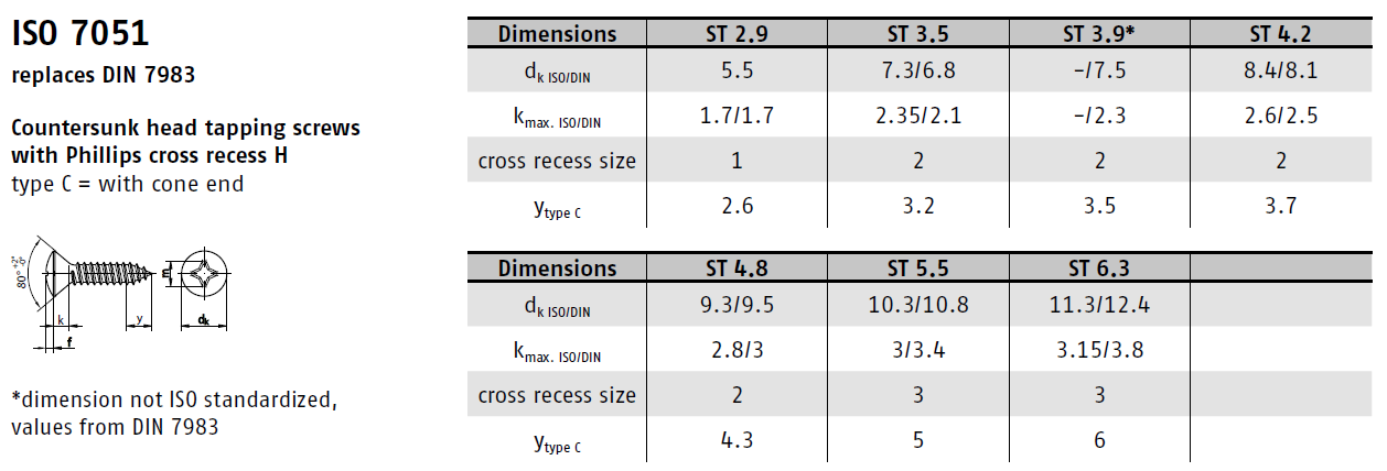 DIN 7983 je norma pro šrouby do plechu s čočkovou hlavou a křížovou drážkou (Phillips). Tyto šrouby jsou navrženy speciálně pro spojování plechů a jiných tenkých materiálů. Díky svému tvaru a vlastnostem jsou ideální pro aplikace, kde je vyžadováno pevné a spolehlivé spojení s minimálním poškozením materiálu.