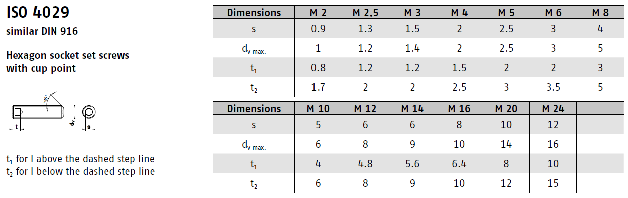 DIN 916 je norma specifikující stavěcí šrouby s důlkem a vnitřním šestihranem (Inbus). Tyto šrouby se používají k přesnému nastavení a zajištění polohy různých součástí strojů a zařízení. Důlek na konci šroubu slouží jako opěrná plocha a zabraňuje jeho protáčení.