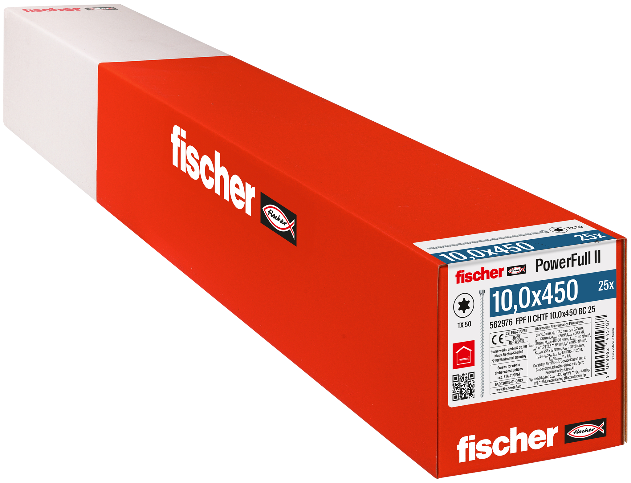 fischer vrut do dřeva PowerFull II má závit po celé délce dříku a je určený pro nosné spoje dřevěných konstrukcí z tvrdých i měkkých typů dřeva. PowerFull II v průměru 10 mm se tvarem závitu odlišuje od průměrů 6 a 8 mm. FPF II 10 má na špičce závitu vrtáček, který bezpečně vede vrut při hlubokém zašroubování. Vyznačuje se nižším rizikem rozštípnutí dřeva a nižším utahovacím momentem. I průměr 10 mm je držitelem ETA certifikátu. Válcová hlava se bezvadně hodí k nenápadném zpevňování a zesilování konstrukčních spojů a prvků.
