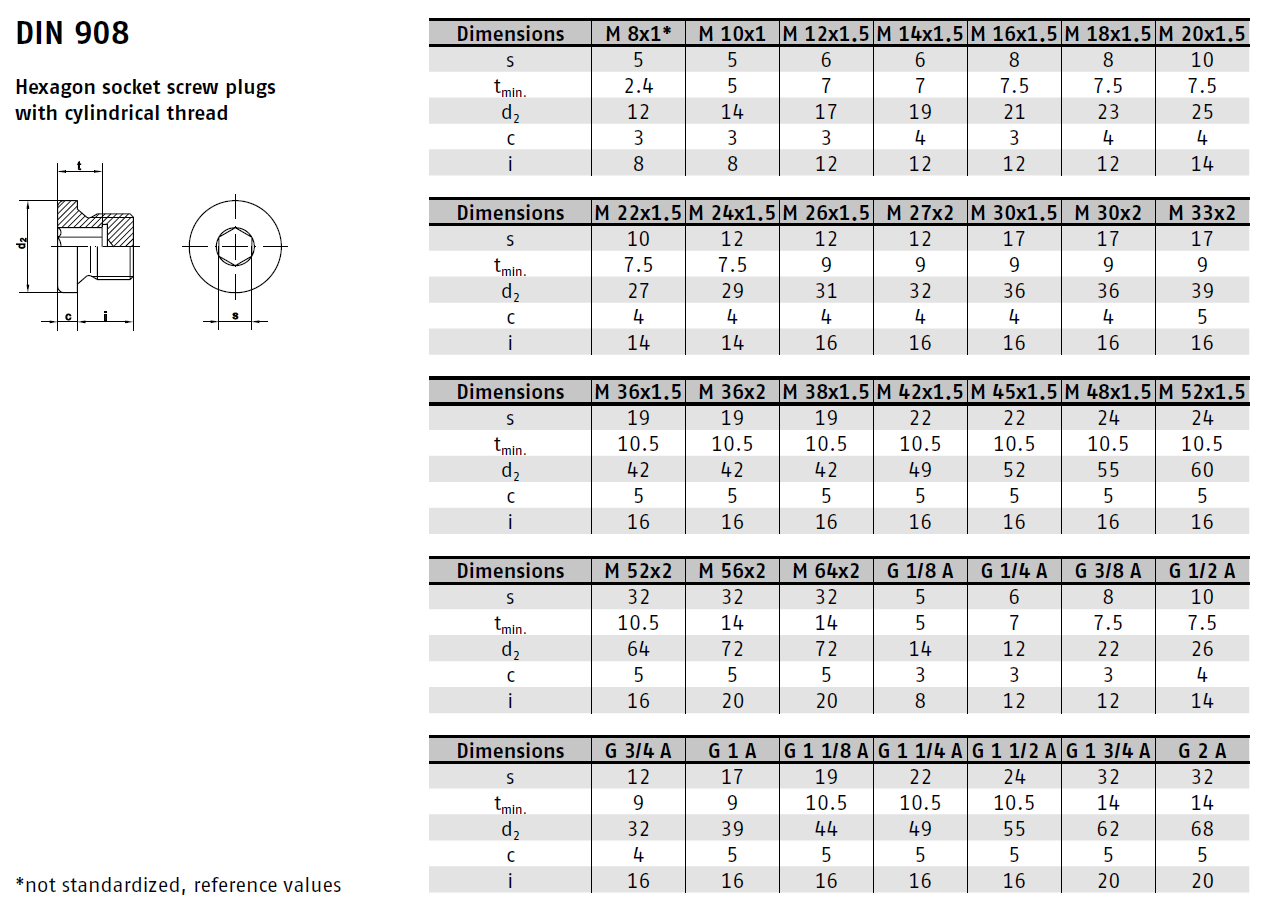 DIN 908 je norma specifikující šroubovací zátky s nákružkem a vnitřním šestihranem. Tyto zátky se primárně používají k uzavírání otvorů v nádržích, nádobách nebo strojních součástech. Nákružek zajišťuje těsnost spoje a zabraňuje vytékání tekutin nebo sypkých látek.